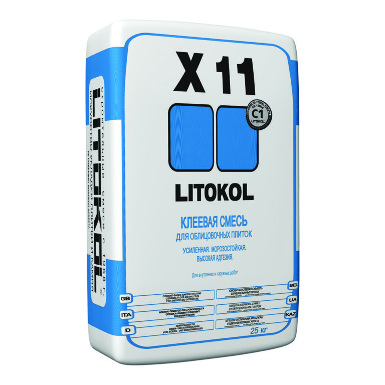 LITOKOL X11 — сухая клеевая смесь на основе серого портландцемента, с полимерными добавками и простыми эфирами целлюлозы. В качестве заполнителей используются кварцевые пески с избирательным гранулометрическим составом. Смешанный с водой LITOKOL X11 образует пластичный удобный в нанесении клеевой раствор. Обладает высокой адгезией к плитке и к основаниям.