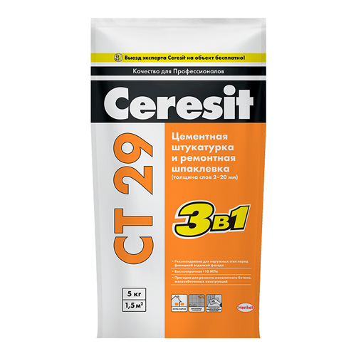 Штукатурка и ремонтная шпаклевка CT 29 предназначена для ремонта, выравнивания и оштукатуривания цементно-известковых, цементно-песчаных, бетонных и кирпичных оснований на стенах и потолках внутри и снаружи зданий, как при ручном, так и механизированном нанесении.Для наружных и внутренних работ.
