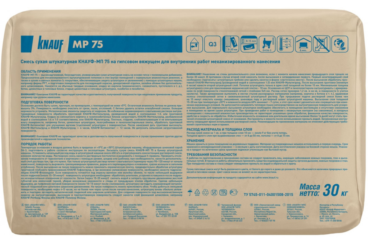 Высокоадгезионная универсальная сухая штукатурная смесь на основе гипса с полимерными добавками.