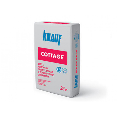 Штукатурная смесь цементная "Кнауф-Коттедж" (Cottage"), 25кг Предназначена для каменной и кирпичной кладки, оштукатуривания фасадов зданий и твёрдых оснований в помещениях с повышенной влажностью, для ремонта старой штукатурки, заделки трещин, заполнения отверстий. Применяется для наружных и внутренних работ.